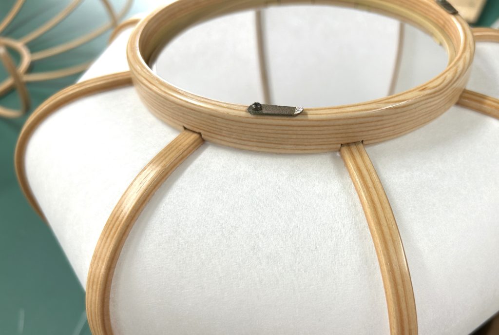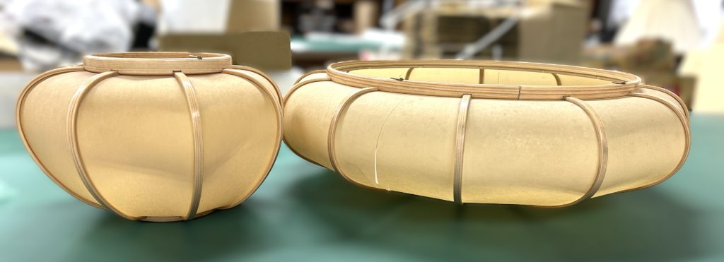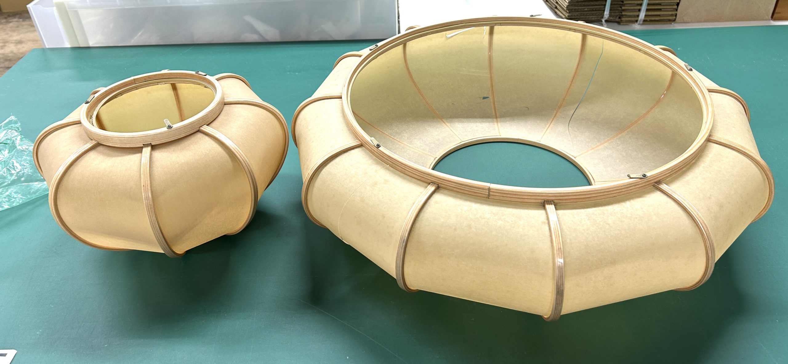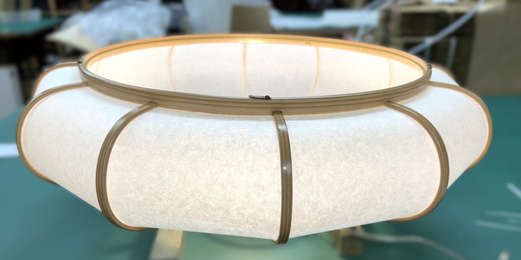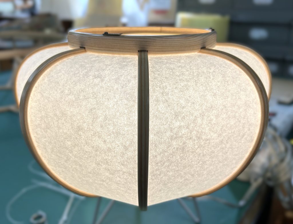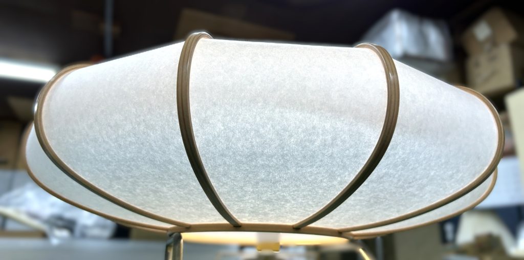古いぼんぼりペンダント照明の張替え 修理 2025.08.10 ホームページをご覧になってお問い合わせ頂いたお客様からのご依頼でした。古くなったシートを剥がし、新しいワーロンシート(無地)を貼りました。